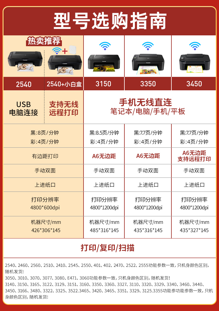 颜色分类: 2540USB款【仅支持电脑打印】 2540无线款【手机+电脑+异地远程】 3160无线款【手机+电脑+A6无边距】 3340无线款【手机+电脑+异地远程】 3460无线款【手机+电脑+异地远程】 3452无线款【手机+电脑+异地远程】 3440无线款【手机+电脑+异地远程】 ❤三年保修 送学习资料 送运费险❤
